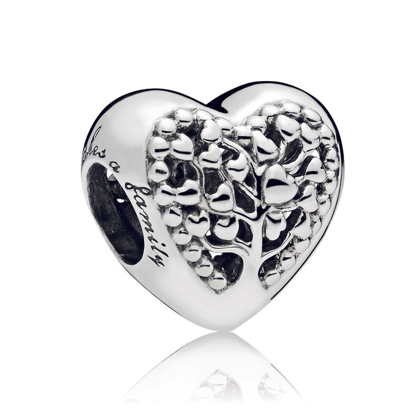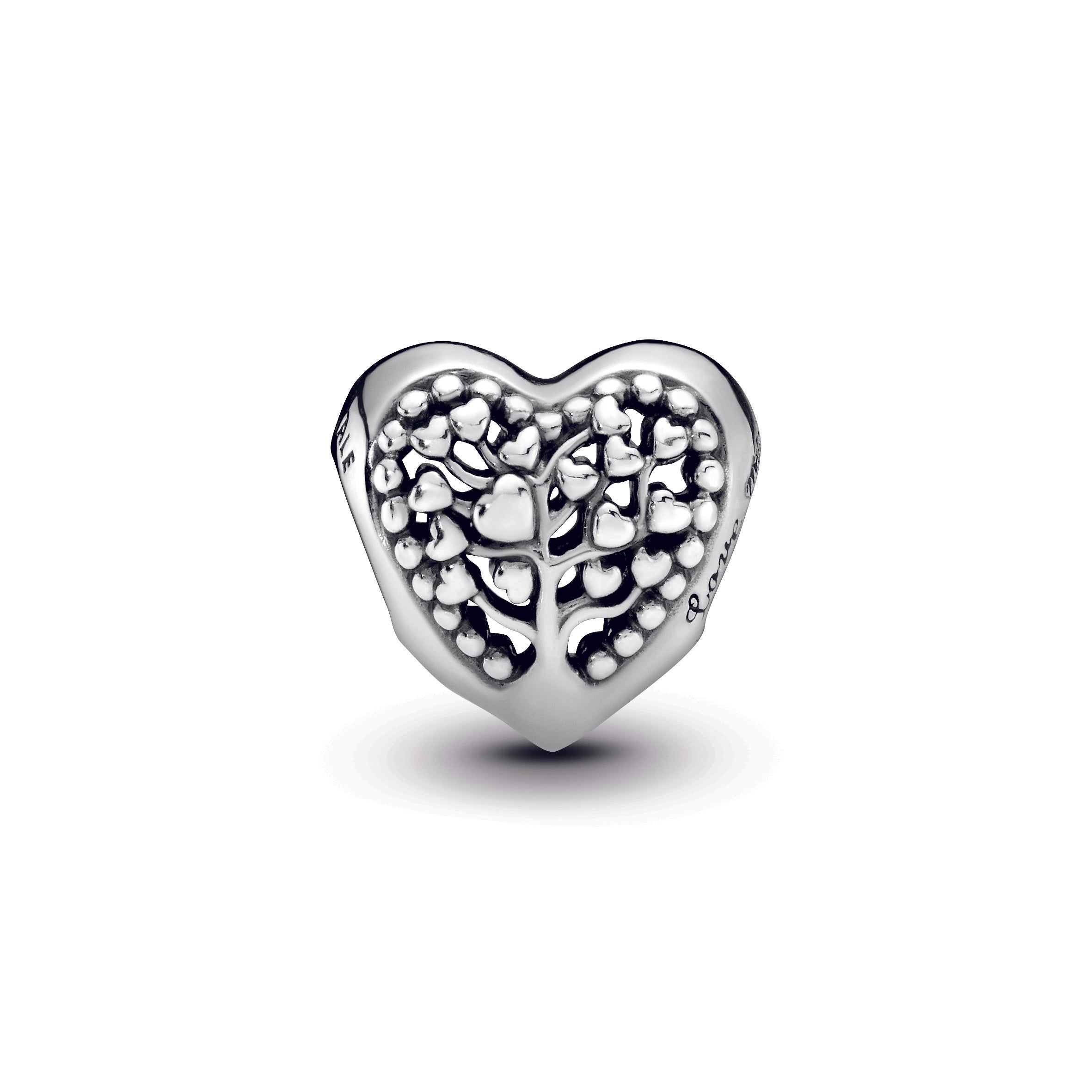 Put family at the heart of your style with this hand-finished. sterling silver charm. Shaped as a heart and detailed on each side with an openwork family tree – a symbol of your kinship – with heart-shaped leaves. Made for Pandora Moments bracelets. the side is engraved with the message Love is a family. A symbol of the bonds that bind you together. gift it to someone your share your story with.