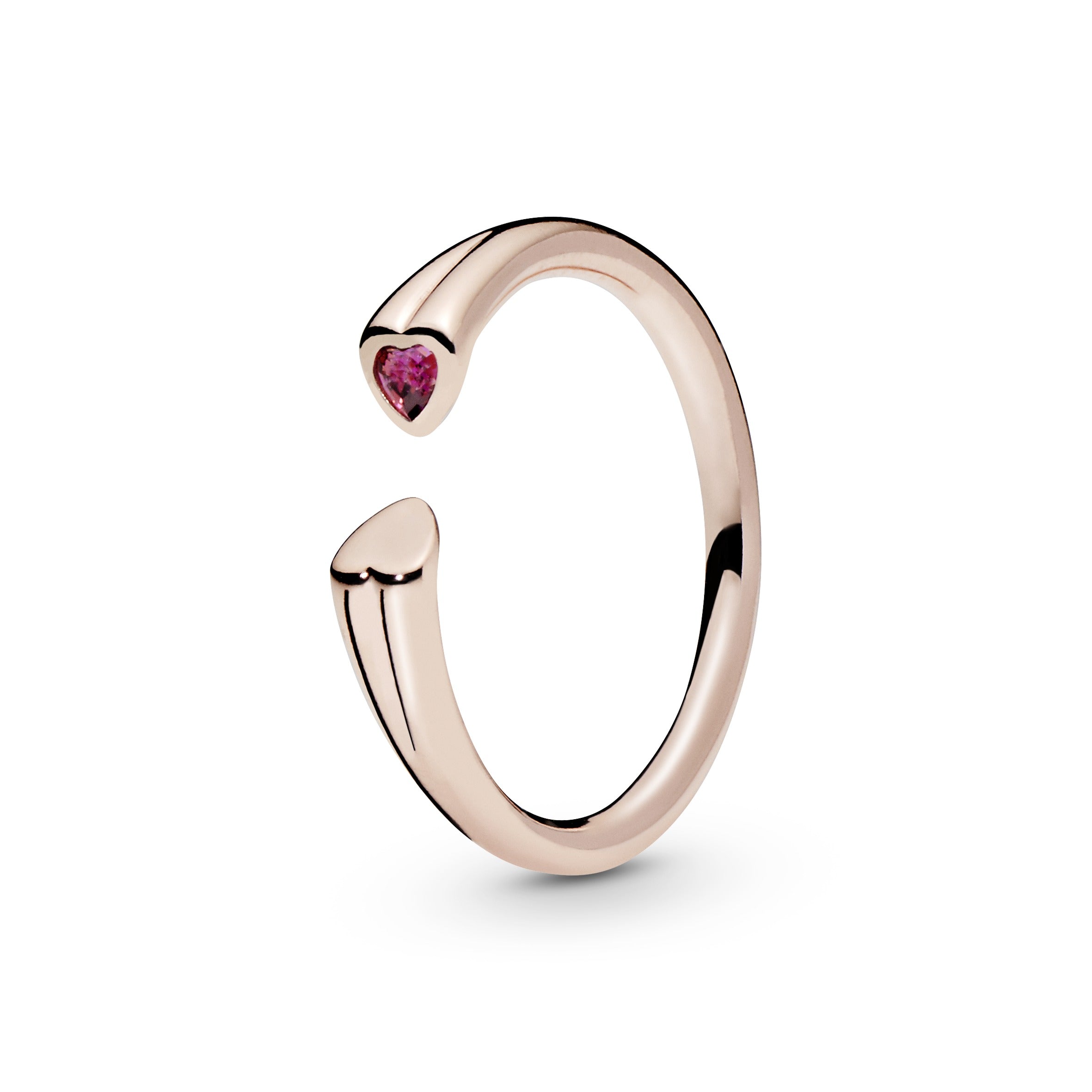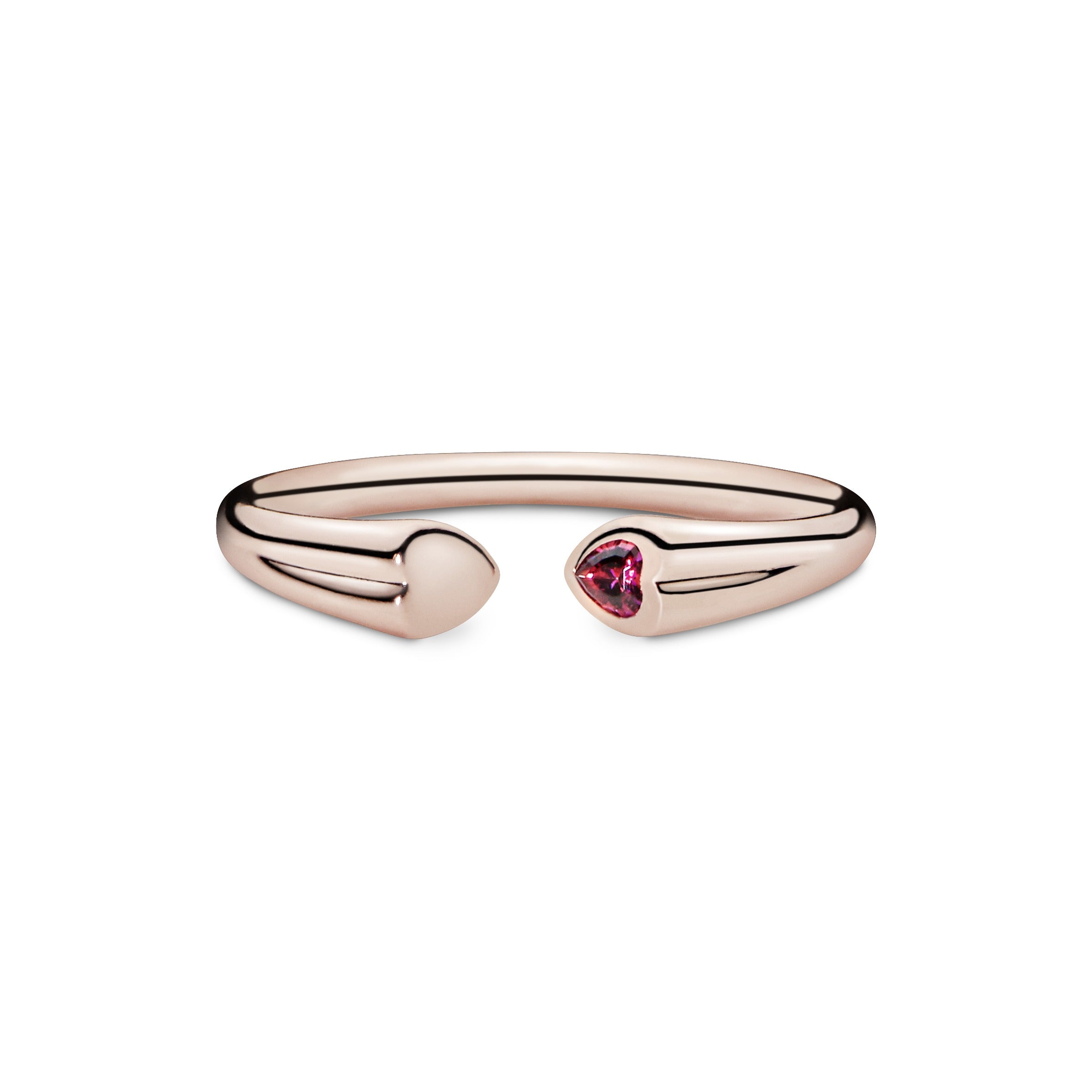 Two hearts are better than one. Carefully crafted in Pandora Rose. our 14k rose gold-plated unique metal blend. this minimalist. open ring is detailed with two hearts. one of which holds a heart-shaped cubic zirconia in a ruby red hue. A perfect gift for someone you love or a little treat especially for you. it looks equally cool worn alone or stacked with other rings.