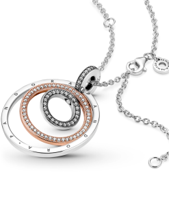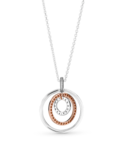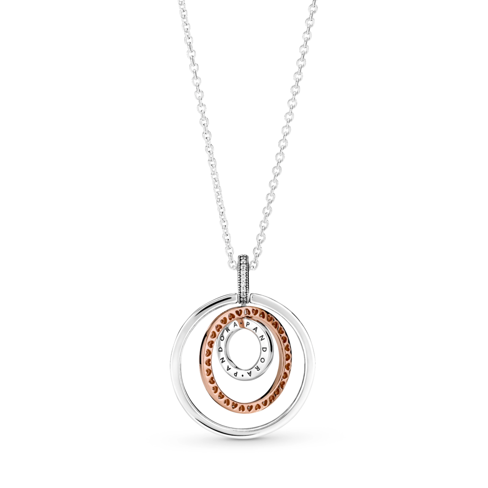 Go geometric with the Two-tone Circles Pendant & Necklace. Hand-finished in sterling silver and 14k rose gold-plating. this necklace features three spinning circles. The outer circle includes Pandora logos on one side and the other side is polished; the 14k rose gold-plated middle circle features clear cubic zirconia pavé framed by micro-beading on one side and cut-out hearts on the other; the centre circle has pavé framed by micro-beading on one side and a Pandora logo on the reverse. The circles can be turned for eight different styling combinations.