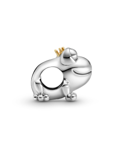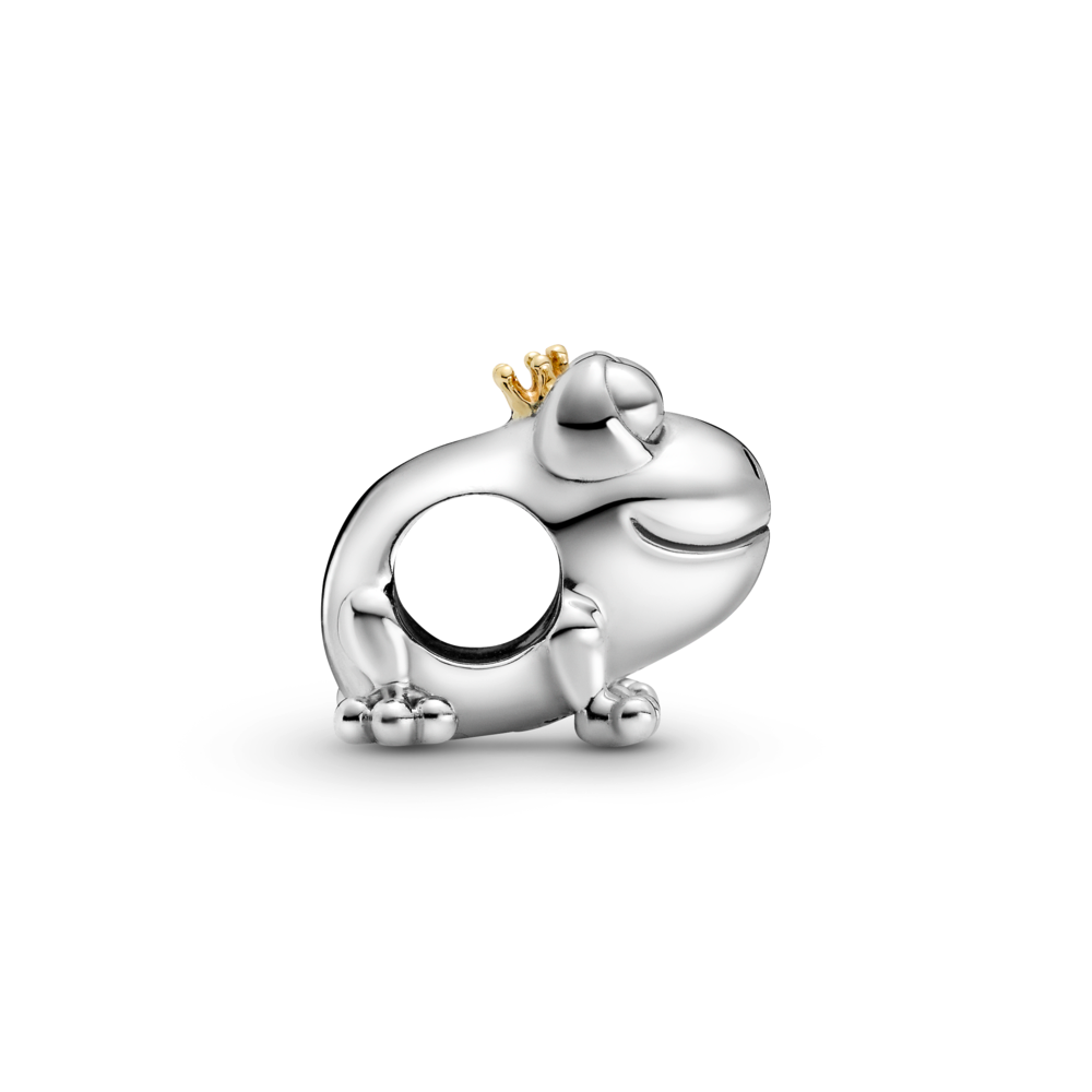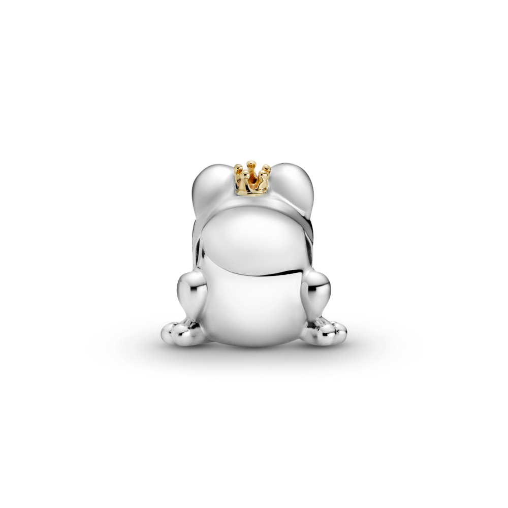 Wear a reminder to believe in true love with the Two-tone Frog Prince Charm. Hand-finished in sterling silver and 14k gold. this charm features a smiling frog with big eyes and micro beaded feet wearing a miniature 14k gold crown. plus a gold hallmark stamp disc on the bottom. Inspired by the idea that you have to kiss a few frogs to finally find your prince. this fairy-tale charm brings a bit of whimsy to any outfit or occasion.