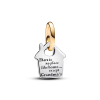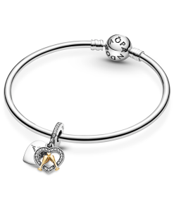 Celebrate a special moment with our Two-tone Happy Anniversary Dangle Charm. Featuring two heart-shaped discs in sterling silver. the front dangle shows two glasses in 14k gold with a gold hallmark. making this charm the perfect way to say congratulations. The outline of the heart and the bail are set with clear cubic zirconia for extra shine. The engraving on the back dangle reads Happy Anniversary. so raise a glass and say cheers to a special milestone!