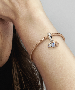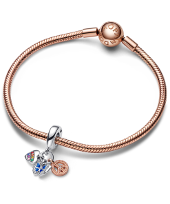 Metal: sterling silver and 14k rose gold-plated unique metal blend Stone: 1 bead-set round brilliant-cut salsa red man-made crystal; 1 bead-set round brilliantcut burnt orange man-made crystal; 1 bead-set round brilliant-cut blazing yellow man-made crystal; 1 bead-set round brilliant-cut royal green man-made crystal; 1 bead-set round brilliant-cut stellar blue man-made crystal; 1 bead-set round brilliant-cut royal purple manmade crystal; 1 bead-set round brilliant-cut fancy fairy tale pink cubic zirconia; 1 micro beadset round brilliant-cut clear cubic zirconia Enamel: princess blue Engraving: Freedom and L?ve and Peace Motif: two-tone heart. peace sign and butterfly dangle Special features: dangling sterling silver heart; on one side of the heart. a curved line of two rows of coloured pavé; on the other side of the heart an engraved message; sterling silver butterfly with enamel details in the heart-shaped centre of the wings; microbead details along the edge of the heart-shaped centre on one side; on the other side an engraved message; 14k rose gold-plated peace sign; on one side microbeads covering the sign and a stone in in the centre; functional hole for stone setting in the shape of a heart on the back of the sign; on the back along one of the sign’s legs is an engraved message; bail with an imprinted heart on each side. Inspiration: Spring and the symbols of peace. love and freedom. The butterfly as the symbol of true uniqueness and beauty of every butterfly.