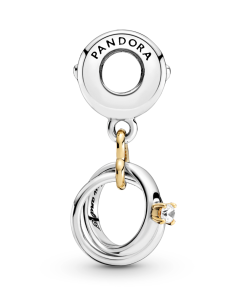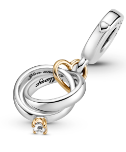 Carry a symbol of forever love with the Two-tone Wedding Rings Dangle Charm. This silver charm features a 14k gold heart link with two entwined rings. one sterling silver solitaire with a sparkling stone set in a 14k gold setting and one sterling silver band. Both feature the engraved messages ‘You and I’ and ‘Forever and always’ inside. The bail includes the iconic Pandora logo and two raised hearts. There’s no better way to symbolize your love and commitment.