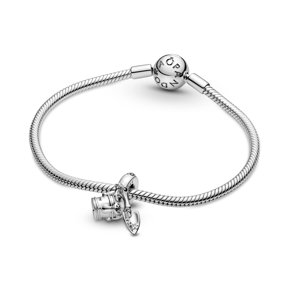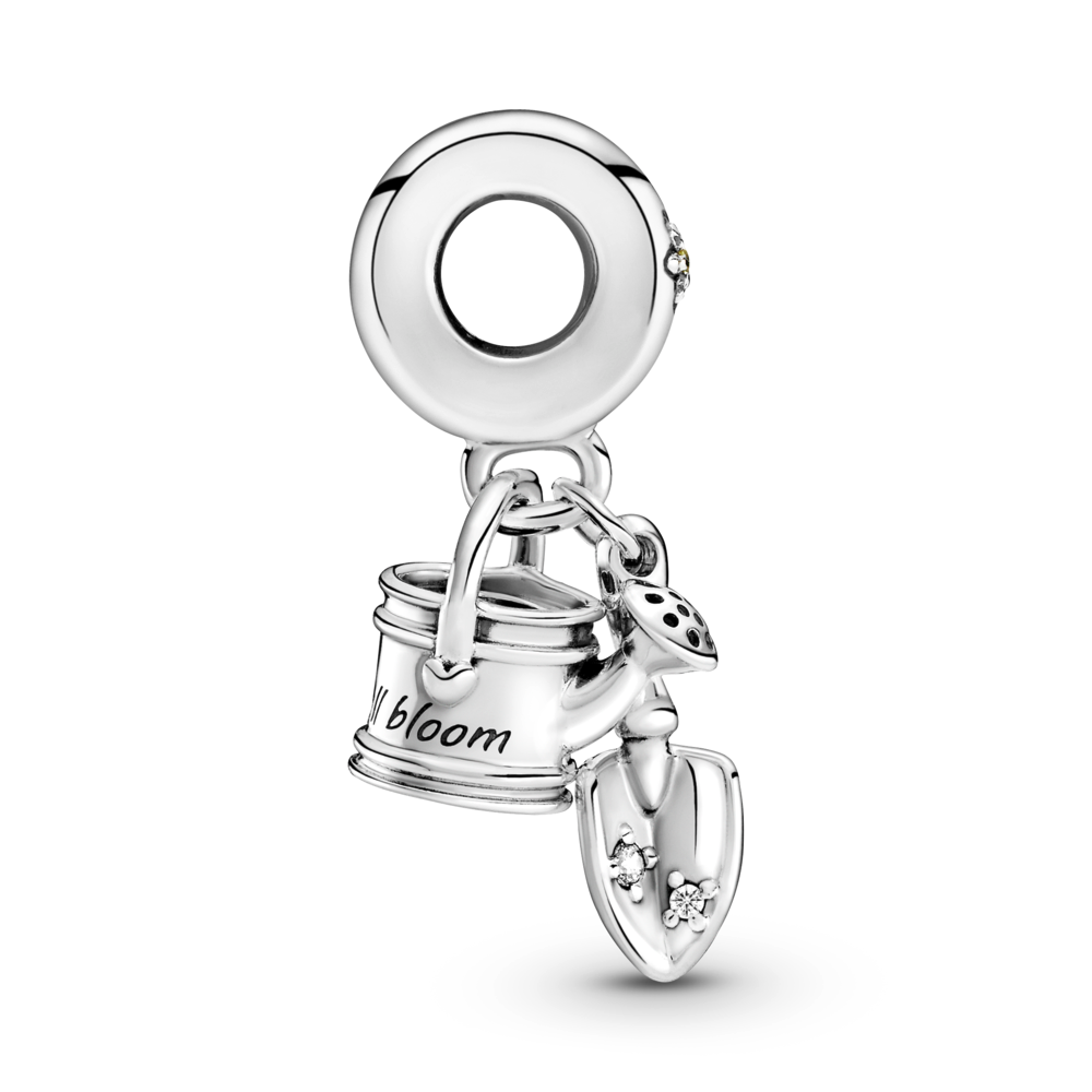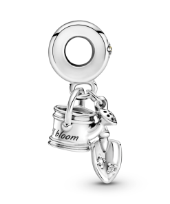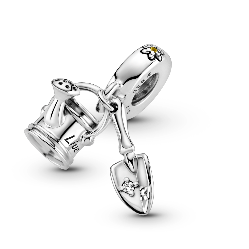 Carry your connection to nature with the Watering Can & Trowel Dangle Charm. Hand-finished in sterling silver. this charm includes a 3D watering can with a ‘Live life in full bloom’ engraving and a trowel featuring two sparkling clear cubic zirconia stones on the blade. The bail features a raised flower with a sparkling yellow crystal in its centre. Wear this gardening-inspired charm as an ode to green fingers and the magic of nature.
