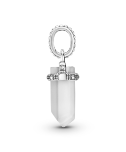 Tap into your inner magic with the Purple Amulet Pendant. Hand-finished in sterling silver. this design features a crystal-shaped frosted white stone with a pointed edge. The stone is encircled by a girdle decorated with stars and microbeading features on the bail for added detail. Wear this pendant with a bracelet carrying charms that represent positive vibes and good fortune as a celebration of your unique power.